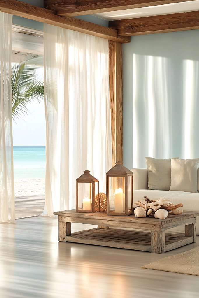 Add seashells and coral decor to enhance the coastal vibe, and display vintage coastal finds for character. Use lanterns for dreamy ambient lighting that captures summer nights.
