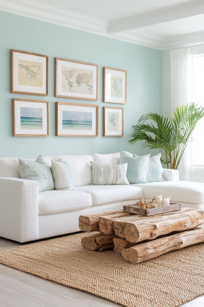 Incorporate a mix of framed artwork, from vintage nautical maps to serene seascapes, and don’t forget playful touches like a ship wheel or a charming anchor. To add depth, layer in textures with woven baskets or driftwood frames.