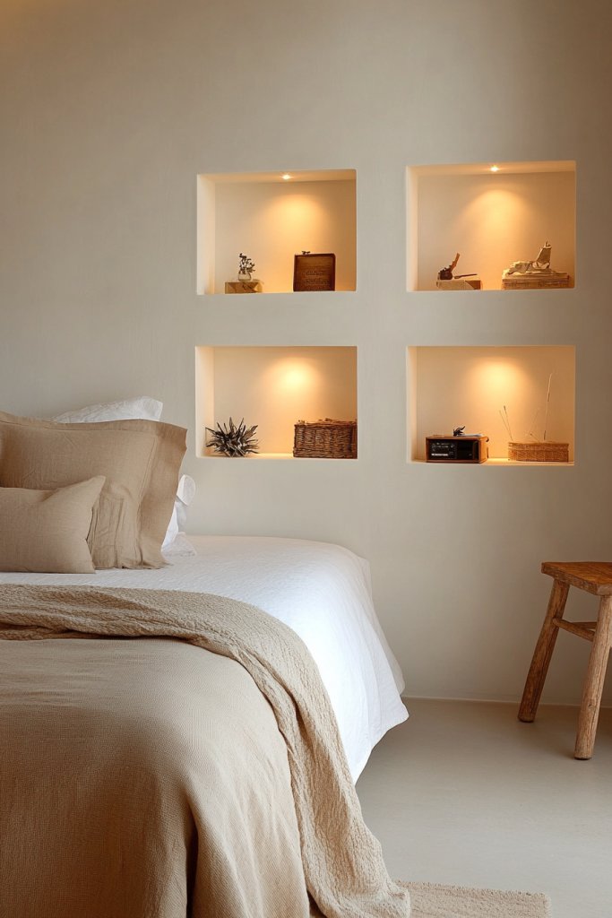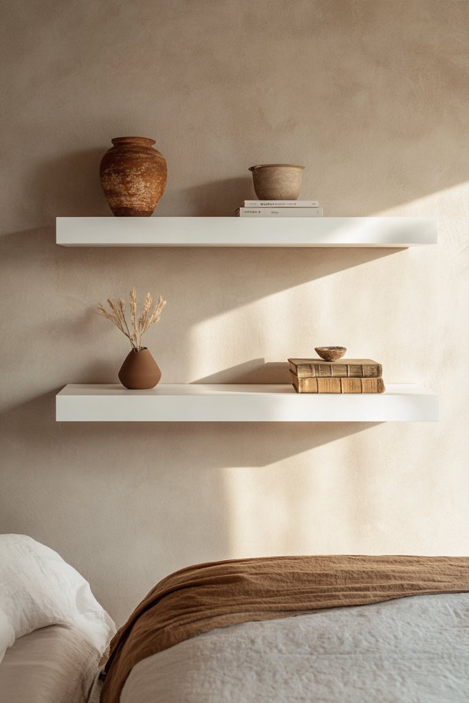 Visualize sleek, narrow shelves mounted just above your bedside or along a blank wall. Decorate with curated books, small sculptures, or meaningful keepsakes. The floating design creates a sense of openness, avoiding bulky furniture clutter. The minimalist aesthetic makes your room look organized and intentionally styled.