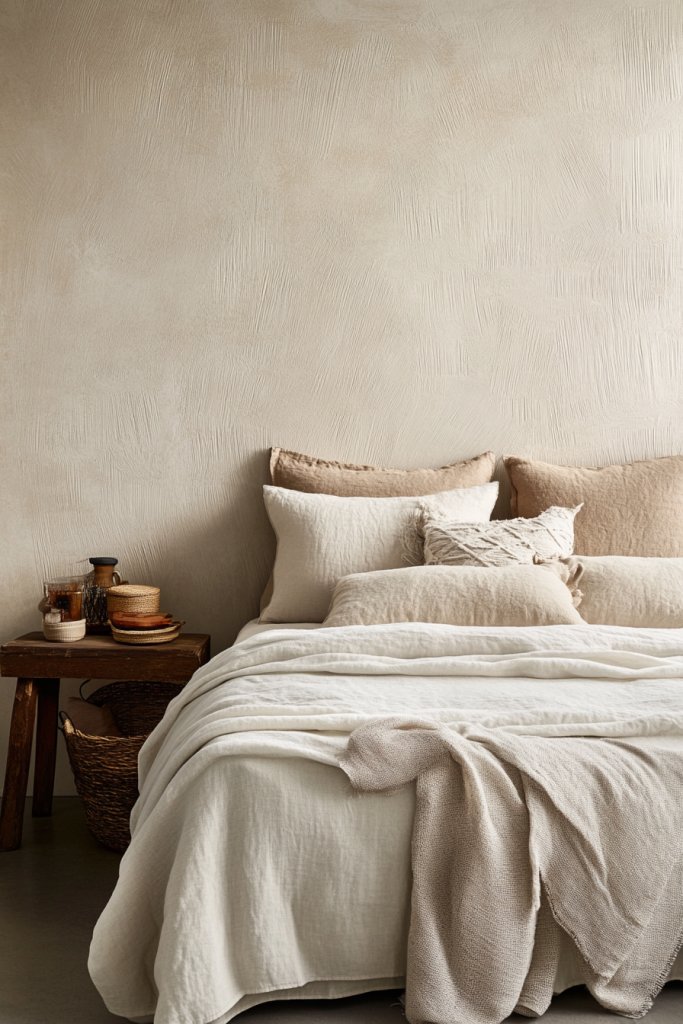 Imagine a wall painted in a single, subtle hue—like warm beige or cool gray—with deliberate brushstroke textures adding dimension. The textured surface catches light differently throughout the day, creating a dynamic visual effect. The understated color palette creates a serene, cohesive environment that feels both luxurious and peaceful.