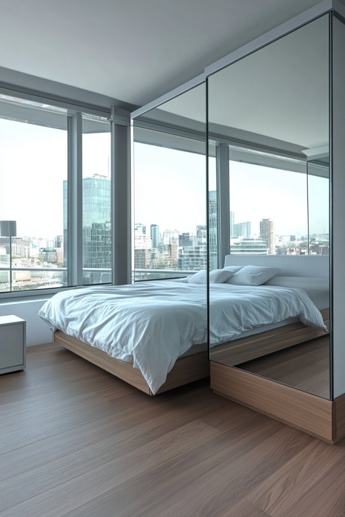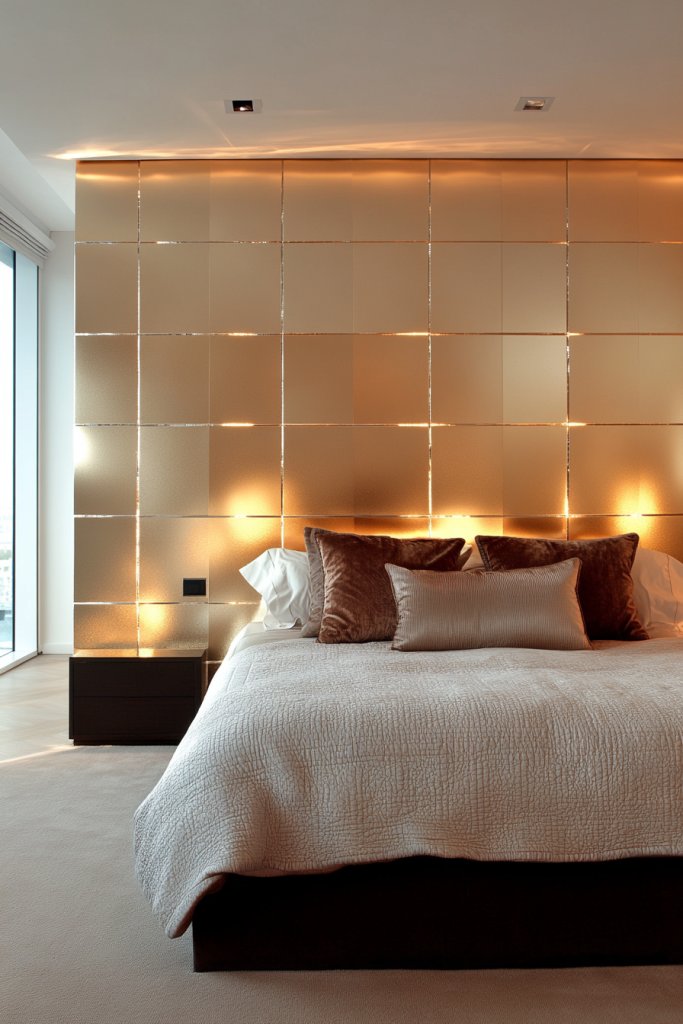 Imagine a wall covered with huge, frameless mirror panels arranged artistically or seamlessly. They reflect your room’s natural light, bouncing it around and eliminating shadows. The effect is a room that looks twice as big, with a sleek, modern vibe. It’s like adding a window where there isn’t one, making your bedroom feel open and airy.