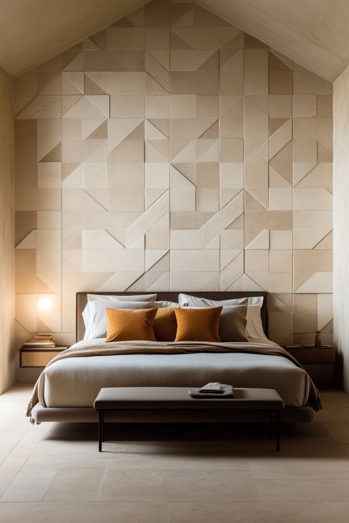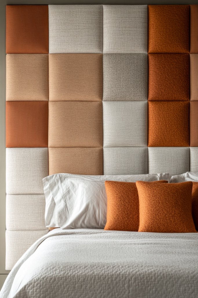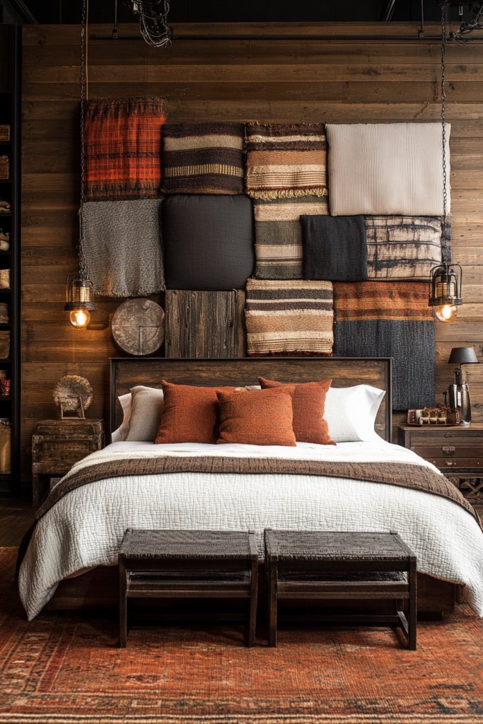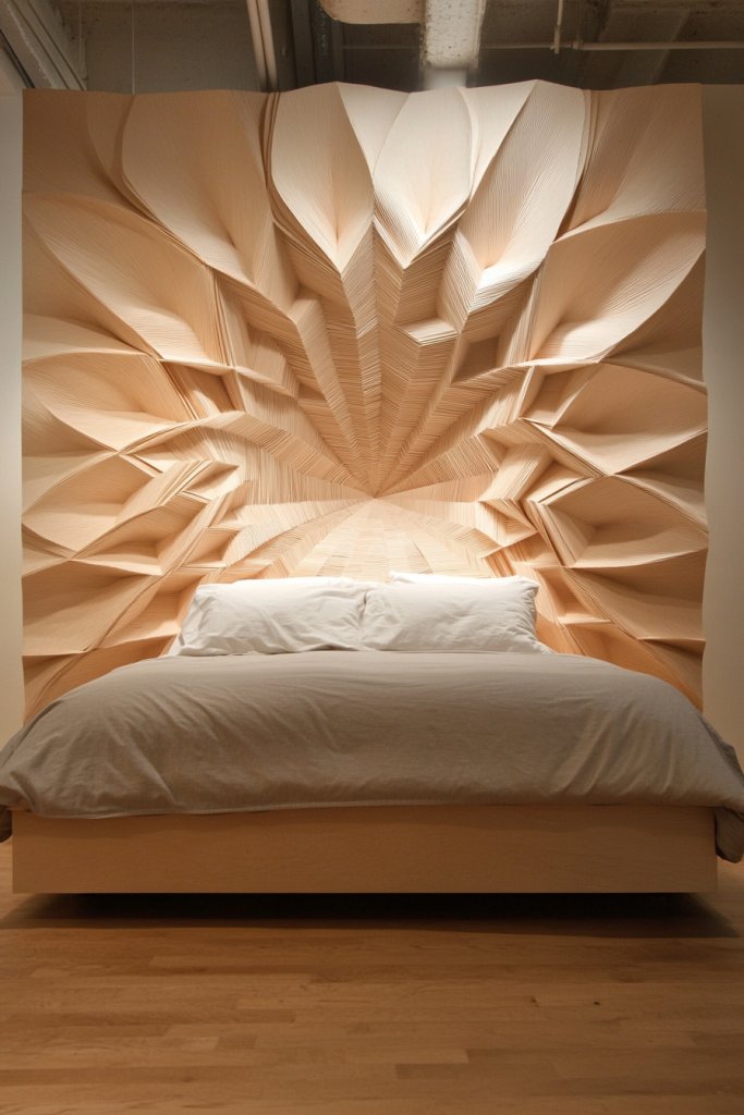 Visualize large fabric panels with intricate quilting or felting, hung like art behind your bed. The textured patterns and layers create visual depth and a sense of crafted luxury. The plush surfaces catch the light differently, making the wall come alive with subtle shadows. It’s a perfect blend of function and aesthetics.