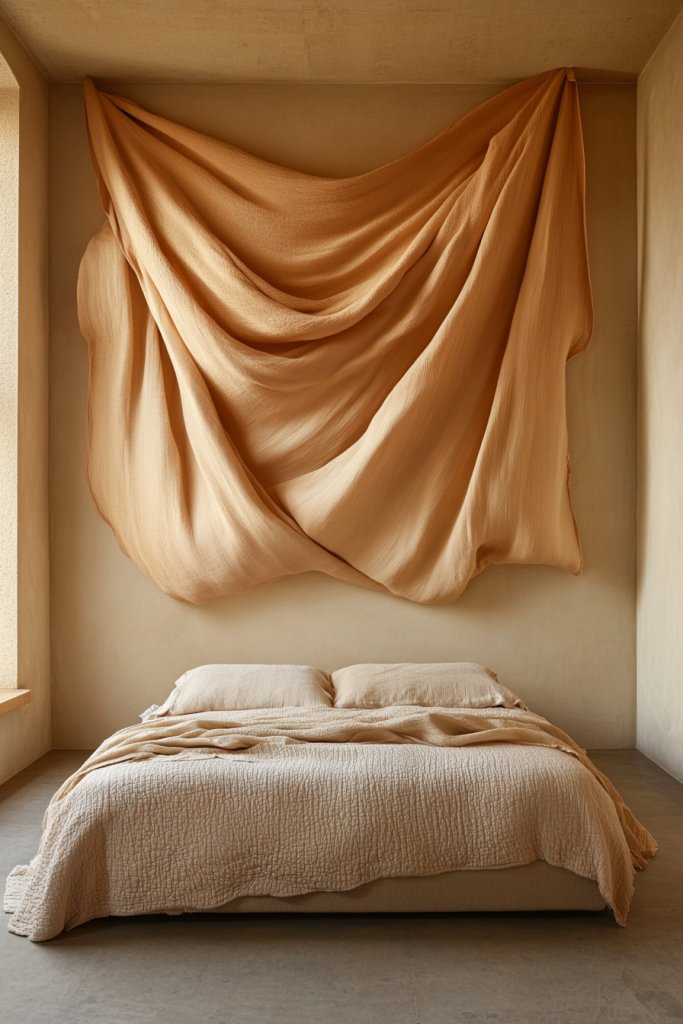 Imagine a large, plush velvet or linen textile draped artfully behind your bed. The fabric’s soft folds and tactile surface add warmth and depth, transforming the entire space. The gentle textures contrast beautifully with smooth bedding and sleek furniture. Subtle embroidery or tassels can add extra personality, making the wall a true focal point.