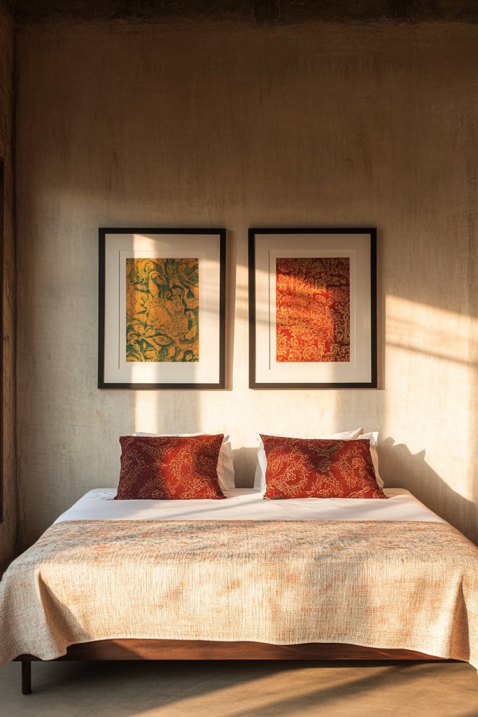Looking to add color and personality without clutter? Framed fabric or canvas prints are a simple way to introduce artful elements that elevate your bedroom’s style. They’re easy to swap out and customize, making your space truly yours.