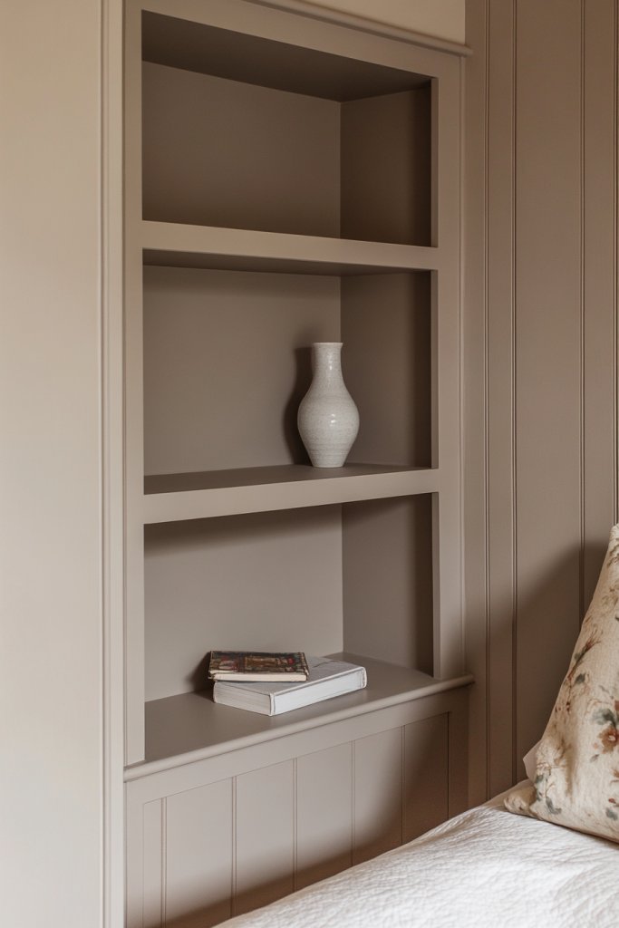 Imagine a wall with vertical or horizontal battens framing recessed shelves or niches painted in a contrasting color. These shelves can hold books, decorative objects, or personal items—keeping essentials at hand yet out of view. The battens add a structured, architectural feel, elevating the room’s overall look. Soft lighting inside the niches can further enhance the display.