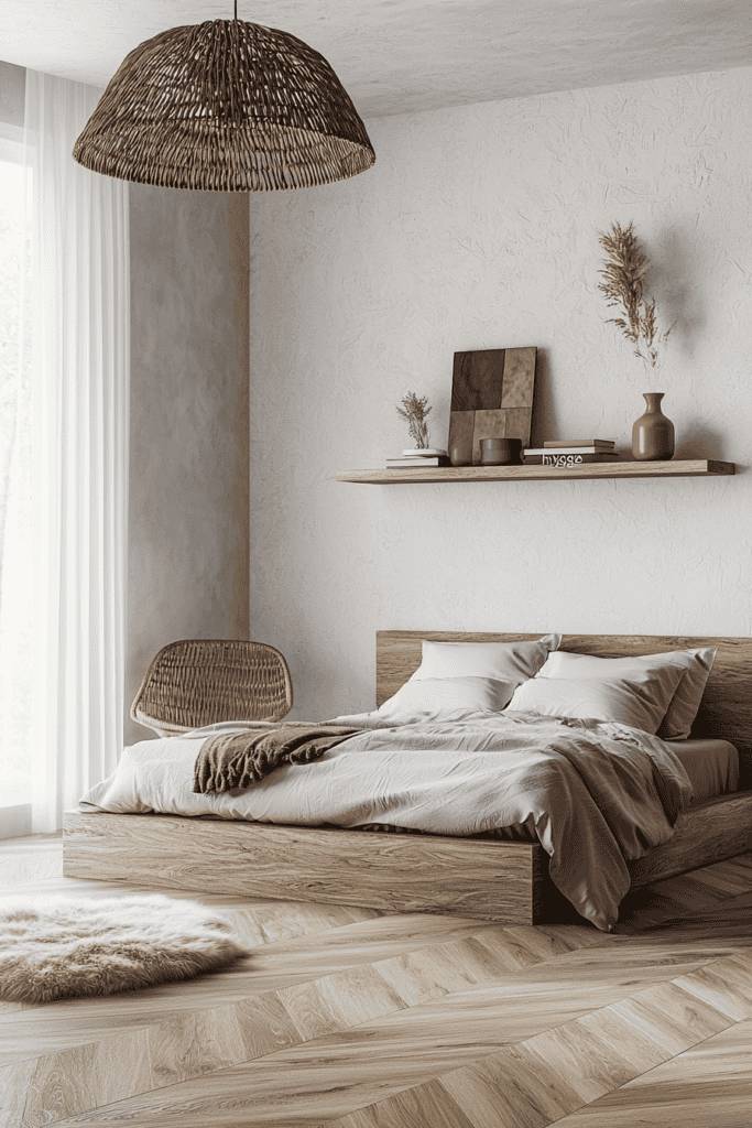 Japandi style blends Japanese minimalism with Scandinavian warmth, creating a serene and harmonious bedroom. This design features a low-profile wooden bed, neutral tones, and natural materials that evoke a sense of calm. Textured plaster walls and a woven pendant light add subtle depth, while a floating wooden shelf holds carefully curated decor. Soft, organic bedding in earthy hues enhances the feeling of relaxation and simplicity. The overall look is warm, airy, and effortlessly elegant.