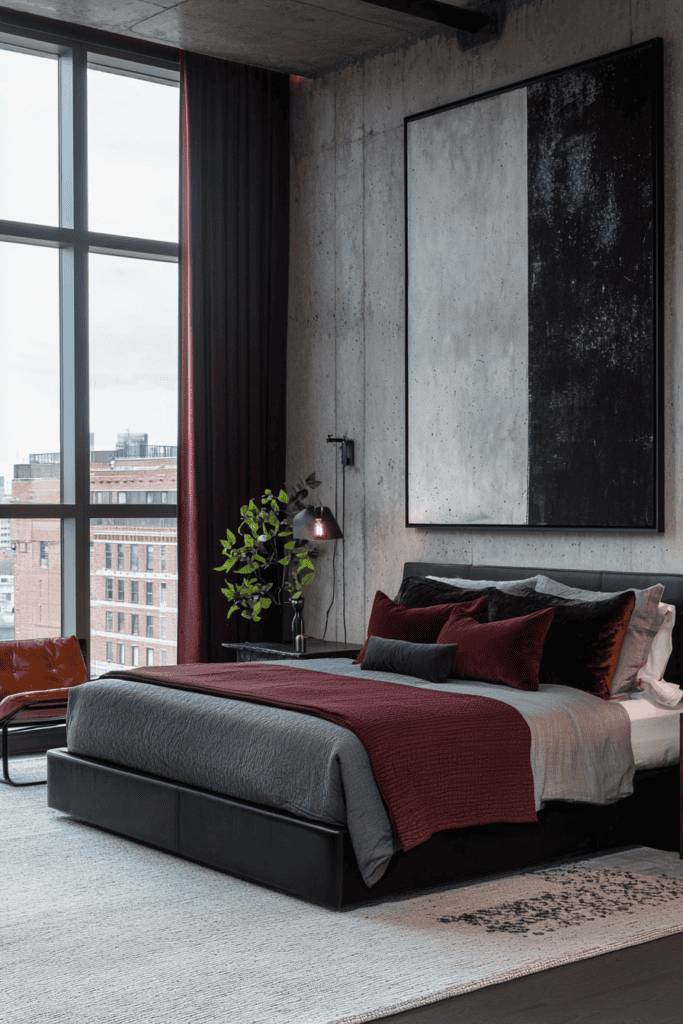 A modern concrete bedroom offers a moody, sophisticated atmosphere with a raw, industrial edge. The concrete walls create a dramatic backdrop, while deep burgundy and black textiles add warmth and richness. Floor-to-ceiling windows provide a stunning cityscape view, enhancing the open and airy feel of the space. The combination of plush velvet pillows, a sleek leather bed frame, and textured bedding balances softness with rugged materials. A statement black-and-white abstract painting adds a contemporary artistic touch.