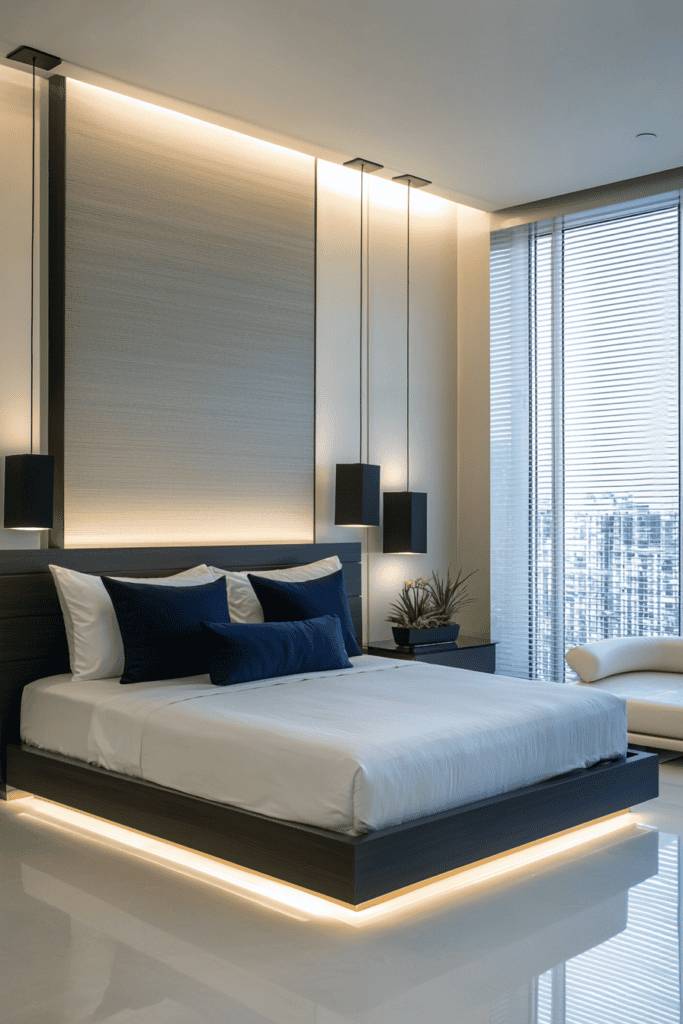 A contemporary bedroom with a floating bed and ambient lighting creates a futuristic and luxurious retreat. The platform bed, illuminated from below, gives the illusion of floating, adding a sleek and modern feel. The backlit headboard wall enhances the ambiance, creating a soft and relaxing glow. Deep navy accents in the pillows contrast beautifully against the neutral white and gray tones. Floor-to-ceiling windows provide a breathtaking city view, reinforcing the modern aesthetic.