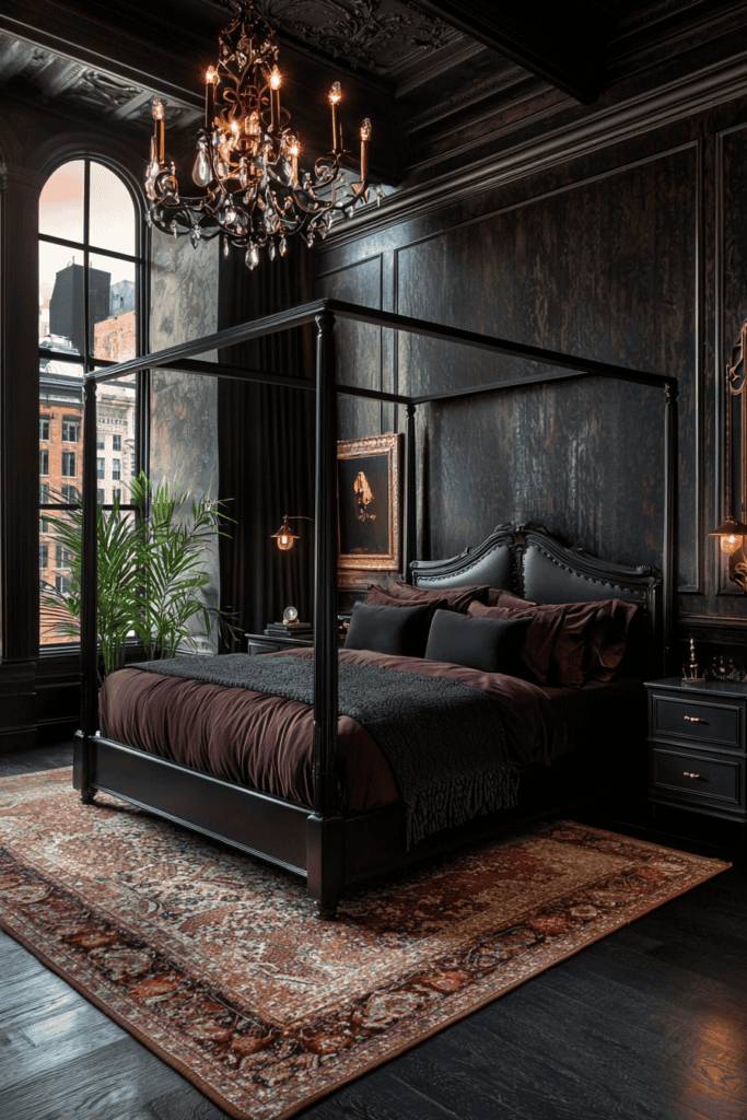 A gothic-inspired bedroom exudes mystery, luxury, and old-world charm through its deep color palette and intricate detailing. The black four-poster bed with ornate upholstery creates a striking centerpiece, while the rich burgundy bedding adds depth and warmth. Dark panel walls with subtle texture enhance the moody ambiance, making the space feel like a regal retreat. A sparkling black chandelier provides an opulent contrast, casting dramatic lighting across the room. The vintage Persian rug softens the dark tones, adding a hint of classic sophistication.