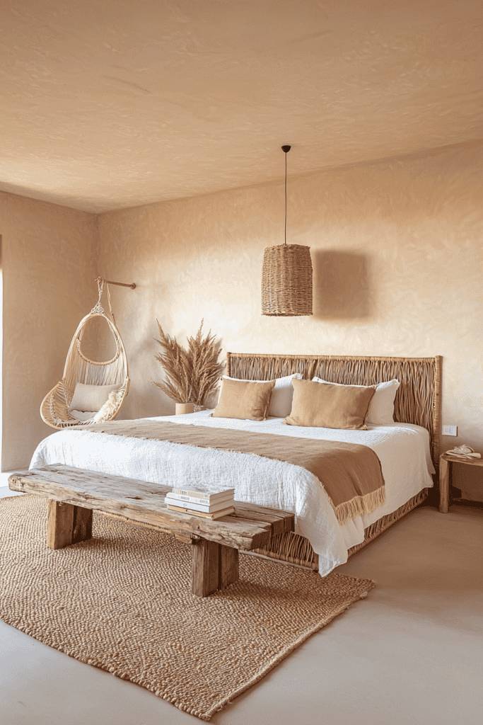 A desert boho bedroom embraces natural textures and warm, sandy hues to create a serene, grounded aesthetic. The woven rattan headboard and rustic wooden bench add a handcrafted, organic feel to the space. Soft beige walls complement the neutral color palette, while natural fiber rugs enhance the cozy ambiance. A hanging rattan chair in the corner provides a relaxed, free-spirited touch. The minimal decor allows the beauty of the natural elements to stand out, creating a tranquil retreat.