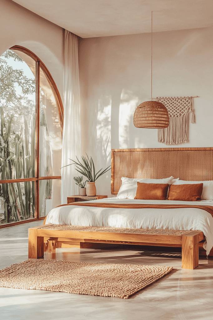 A natural retreat bedroom focuses on warmth, simplicity, and the beauty of raw materials. The wooden bed frame and matching bench set the foundation for a cozy, nature-inspired space. Earthy tones in the bedding and decor create a calm and welcoming ambiance, while the woven light fixture adds an organic touch. Large arched windows allow natural light to pour in, connecting the indoors with the surrounding environment. A combination of soft textiles and sturdy wood creates a perfect balance of comfort and rustic charm.