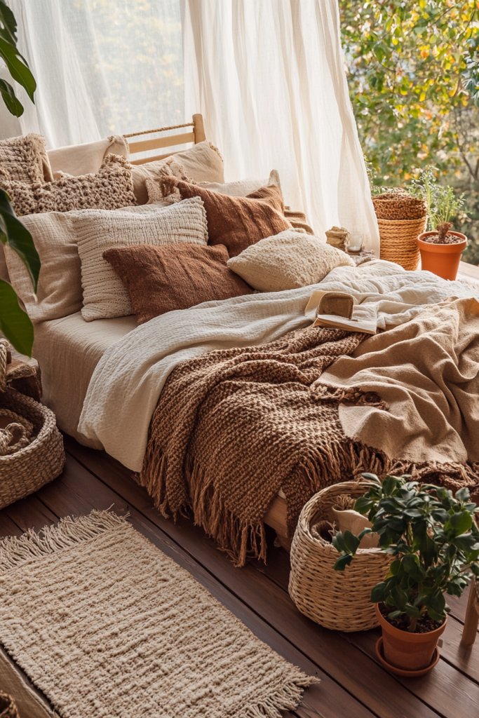 1. Cozy Boho Retreat with Layered Textiles and Natural Elements