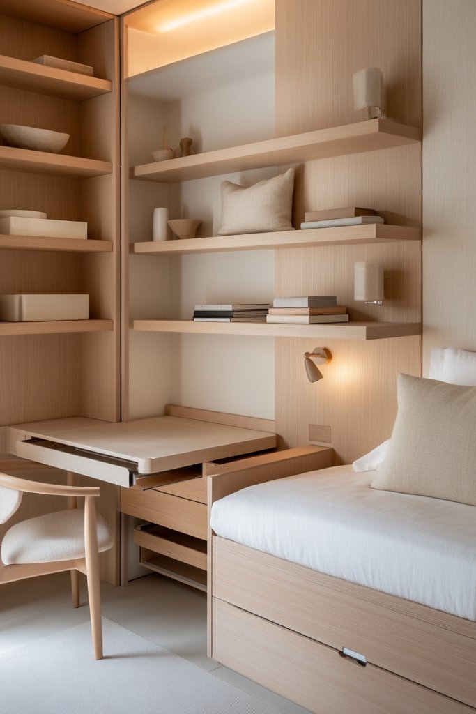 Visualize a room where floating shelves display essentials and decorative items, freeing up surface space. A fold-down desk tucked into a wall nook provides workspace when needed and folds away when not. A bed with built-in drawers or a storage platform keeps clothing and linens organized. The room feels open and uncluttered, with clean lines and smart use of vertical space. Soft lighting highlights the functional yet stylish design, making the room both practical and inviting.