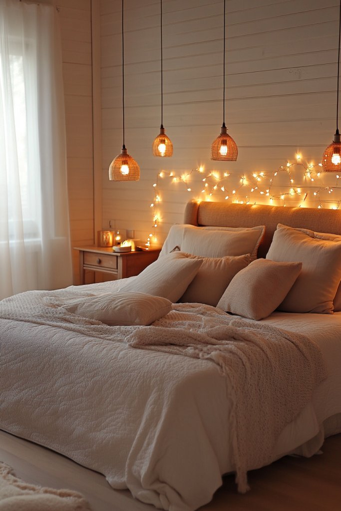 12. Layered Lighting with Pendant Lights, Bedside Lamps, and Fairy Lights