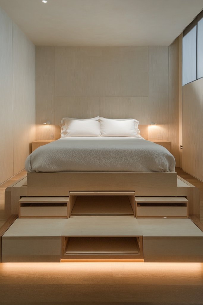 Struggling with clutter and limited space in your bedroom? An elevated platform bed with built-in storage is the perfect solution. It combines style and function, giving you a sleek focal point while cleverly hiding away your essentials. If your current bed is an open invitation to mess, this idea helps you stay tidy effortlessly.
