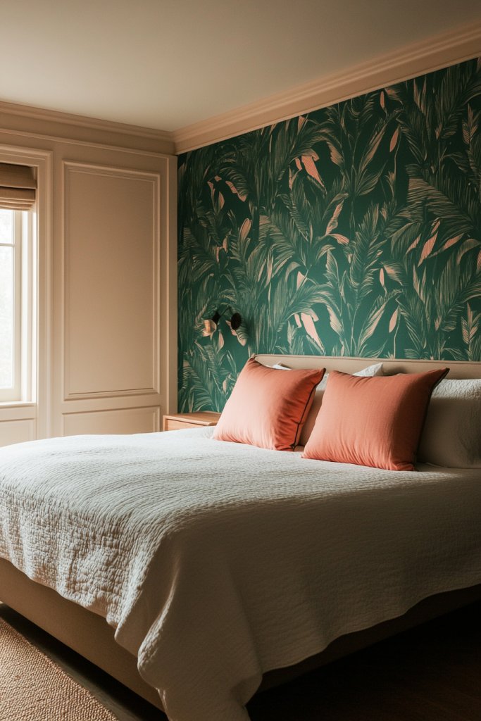 Picture a single wall adorned with bold geometric wallpaper in shades of navy and white, or a subtle floral pattern in soft pastels. Alternatively, removable wall decals create a dynamic feature—think large-scale botanical prints or abstract designs. The surrounding walls are kept neutral to let the accent wall shine. The contrast adds depth and visual interest, making the room feel more curated and stylish. Good lighting enhances the pattern, giving your space a fresh, lively feel.