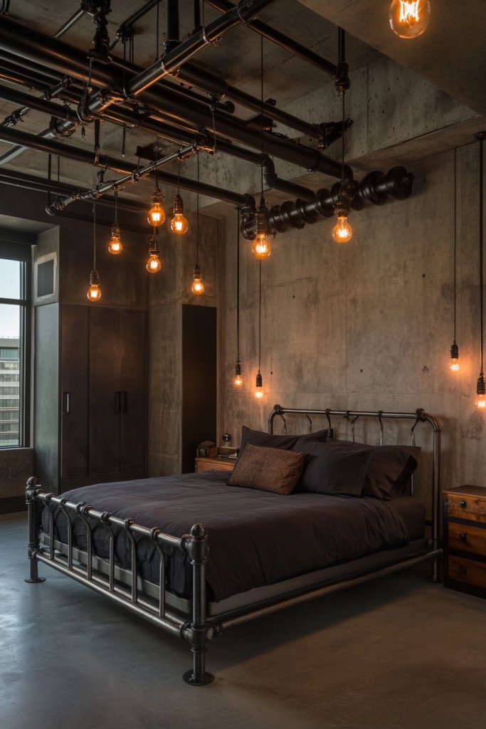 Envision a room with a dark metal bed frame paired with a reclaimed wood headboard. Exposed ductwork and brick walls add texture and character, while vintage-inspired pendant fixtures hang from the ceiling. Industrial-style bedside tables feature metal pipes or wire frames, topped with simple, functional accessories. Concrete floors or large, patterned rugs ground the space. A large window floods the room with natural light, highlighting the mix of rugged and sleek elements.