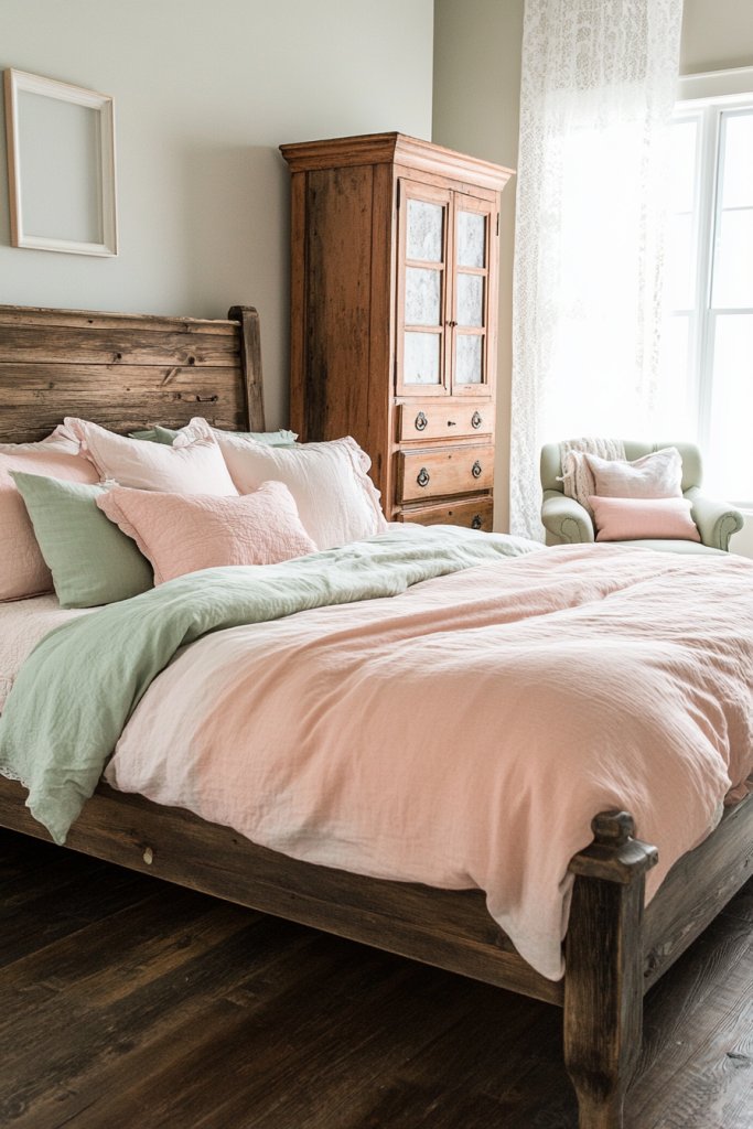 Start by sourcing vintage or secondhand furniture—thrift stores, flea markets, or online marketplaces are gold mines. Refinish or repaint pieces to suit your color palette, focusing on soft pastel shades like blush, mint, or lavender. Mix in textured textiles such as linen or lace curtains and coverlets to soften the look further. Incorporate vintage accessories like picture frames, jewelry boxes, or old clocks to add charm. Keep the layout open and inviting, with space to show off your favorite repurposed finds.