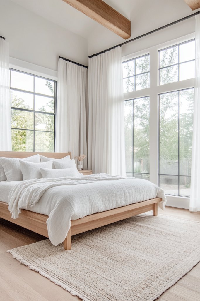 Imagine a room painted in soft whites and light greys, with furniture in pale wood finishes. A platform bed with a clean-lined headboard sits beneath large windows dressed with sheer curtains that diffuse natural light. The decor is minimal: a few textured cushions, a cozy throw, and a simple pendant or sconce for lighting. A neutral-toned rug anchors the space, while open shelves showcase carefully curated essentials. The overall effect is bright, uncluttered, and inviting.