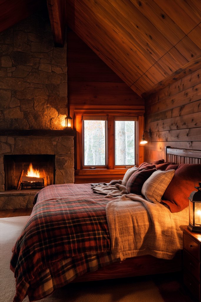 Picture reclaimed wood paneling on the walls paired with a sturdy, distressed wood bed frame. Layered bedding in warm, earthy tones like rust, deep green, or tan adds to the cozy feel. Textured throws and plush pillows invite relaxation, while candles and lantern-style lighting set a warm, flickering glow. Decor includes woven rugs, antler accents, or vintage signs—elements that evoke the great outdoors. Natural light streams in, highlighting the rich textures and warm palette.