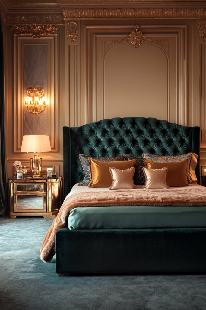 Envision a room with a velvet upholstered headboard in deep emerald or blush pink. Gold or silver accents adorn the furniture—perhaps a mirrored dresser or metallic side tables. Lighting includes a shimmering chandelier or ornate sconces that cast a warm, inviting glow. Bedding in silky fabrics with decorative cushions adds richness, while a plush rug grounds the space. Decorative mirrors or metallic art pieces create focal points, reflecting light and adding glamour.