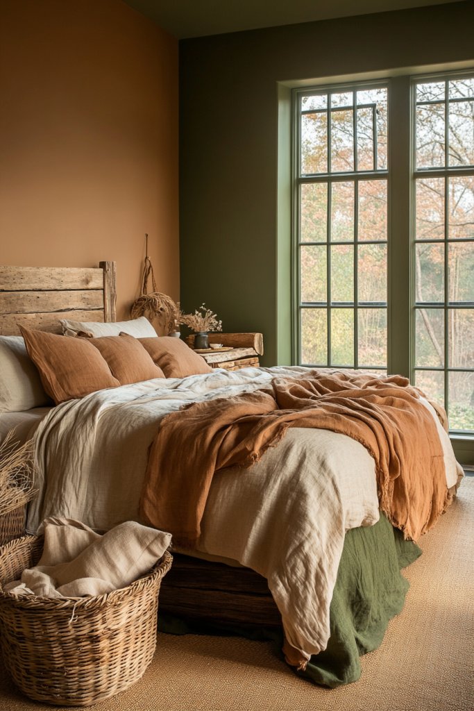 Imagine walls painted in soft terracotta or muted sage, complemented by furniture made from reclaimed wood or bamboo. Bedding in organic cotton or linen in earthy tones like ochre or olive adds softness. Decor includes woven baskets, textured rugs, and natural fiber curtains that filter sunlight gently. Small details like driftwood accents or stone sculptures evoke the outdoors, while potted plants are avoided per restriction. The overall effect is a calming, earthy retreat.