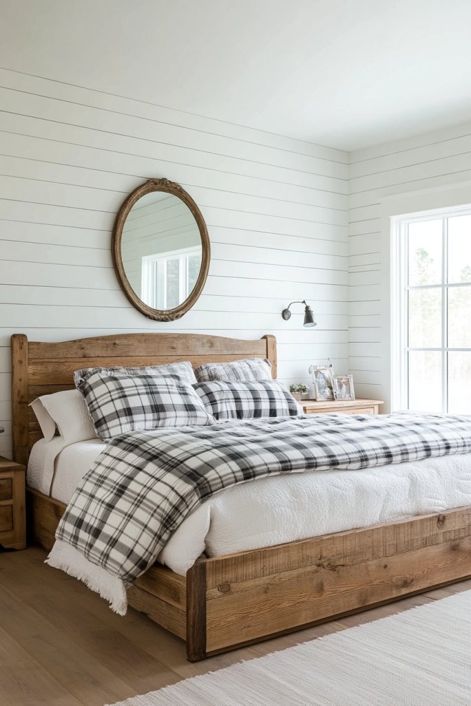 Picture shiplap walls painted in soft white or pastel shades, paired with distressed wood furniture. A large, comfortable bed with a plush quilt or simple linen bedding becomes the centerpiece. Vintage finds like a reclaimed wood dresser or a metal pendant light add character, while cozy textiles like plaid throws or linen curtains enhance the rustic feel. Worn-in wooden floors and antique accessories complete the look, creating a space that’s both inviting and charming.