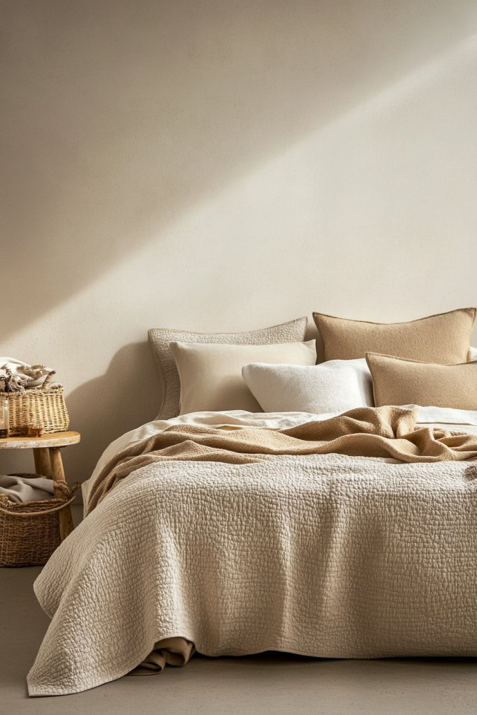 Imagine soft beige and taupe walls, layered with plush, textured linens that invite you to sink right in. A chunky knit throw blanket drapes over a bed with silky-smooth sheets, catching the light just enough to add warmth. Light-colored pillows with subtle patterns add depth without overwhelming the senses. The overall effect is a serene, tactile experience that feels like a hug from your favorite sweater.