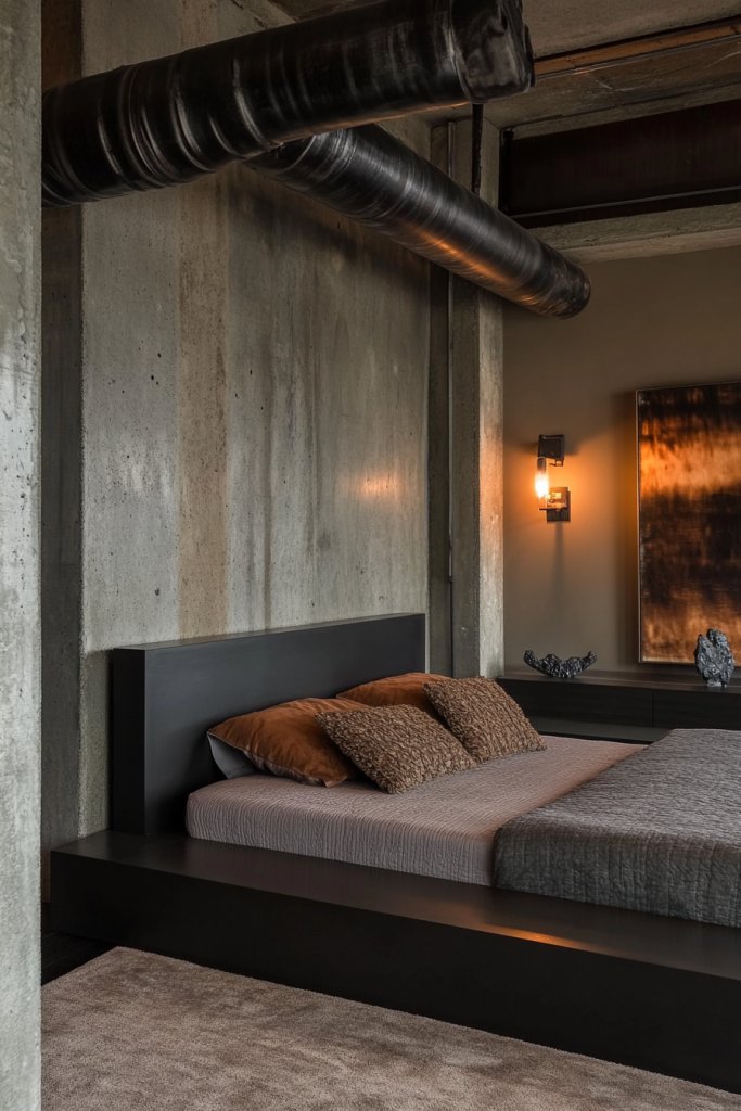 9. Industrial Style with Exposed Elements and Dark Finishes