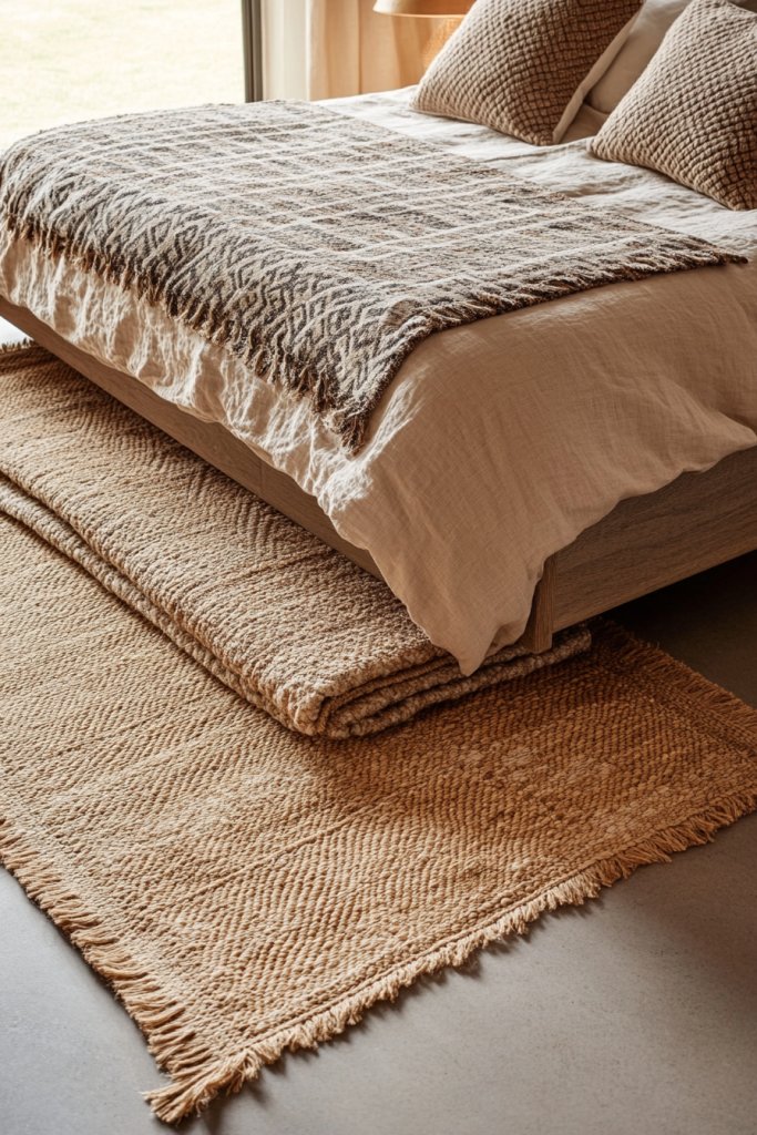 Picture a room with a large, neutral-toned base rug, topped with a smaller patterned or textured rug in contrasting hues. The layering creates depth, while different fabrics—such as a shaggy rug under a flat-woven one—invite tactile exploration. The combination defines zones, like a sleeping area or reading nook, making the room feel multi-dimensional and inviting.