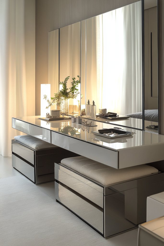 Imagine a compact vanity with a sleek, mirrored surface that doubles as storage. Soft lighting, such as LED strips or sconces, illuminates your face perfectly. A small stool or chair in a plush fabric invites you to sit comfortably. The mirror reflects your space, making it look larger and brighter, while neatly organized compartments keep your beauty essentials at hand.