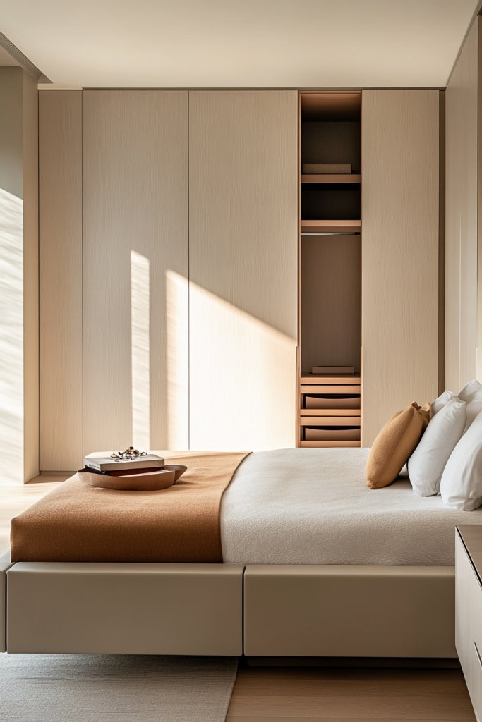 Picture a bedroom with sleek, seamless furniture that blends into the walls. Hidden drawers and under-bed storage keep your belongings out of sight, while floating shelves display only a few curated items. Surface surfaces are kept clear, with only essential items on top—like a minimalistic clock or a decorative tray. The overall look is airy, open, and calming, with every item having its designated place.