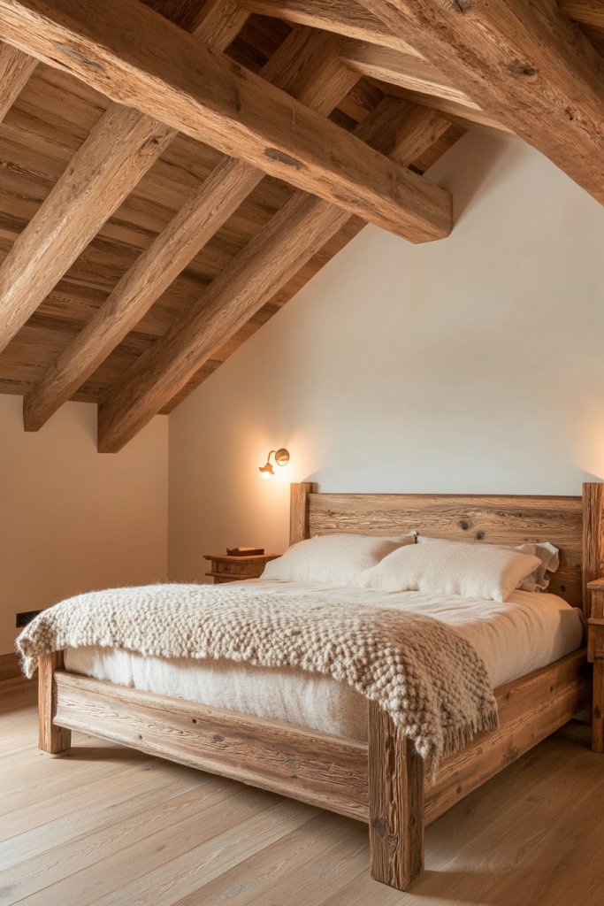 Envision reclaimed wood furniture with rough-hewn textures paired with soft, neutral linens. Wooden beams or paneling add depth and character, while a distressed finish on furniture keeps the look authentic. Warm tones of honey, caramel, or deep brown dominate, creating a cocoon-like atmosphere. Small touches like wooden picture frames or carved accents enhance the rustic appeal without overwhelming the senses.