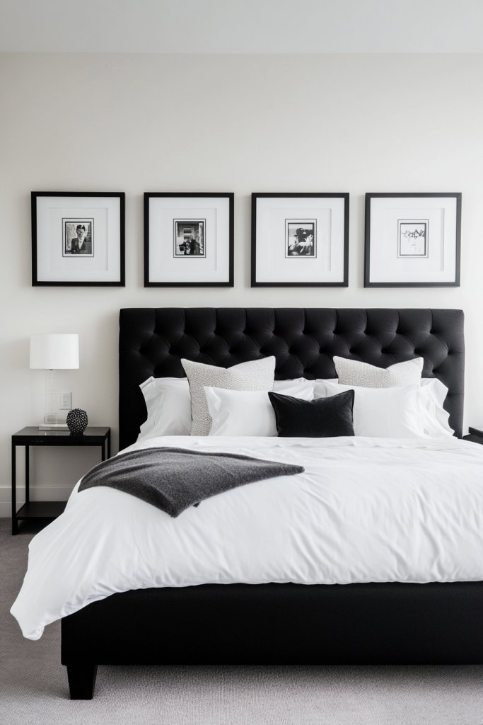 Visualize crisp white walls contrasted with deep black accents—perhaps a black headboard or side tables. Bedding uses a mix of textures: a silky white duvet with matte black pillows, creating visual interest. The room’s lighting softens the starkness, with warm-toned bulbs casting gentle glows on monochrome decor. Minimalist art or geometric patterns add modern flair without clutter.