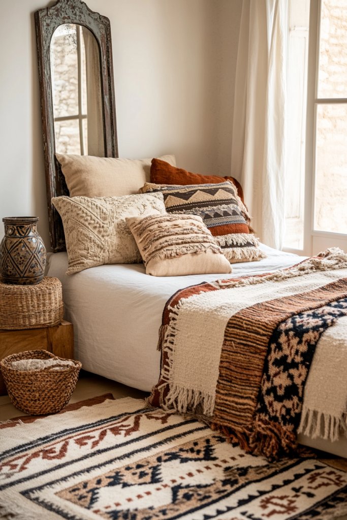 Mix patterns and textures—think Moroccan rugs, fringed throws, and embroidered pillowcases. Use vintage furniture pieces alongside modern basics for contrast. Incorporate seasonal textiles like lightweight linens in summer or chunky knits in winter. Personalize with handmade decor or heirloom finds to make the space truly yours.