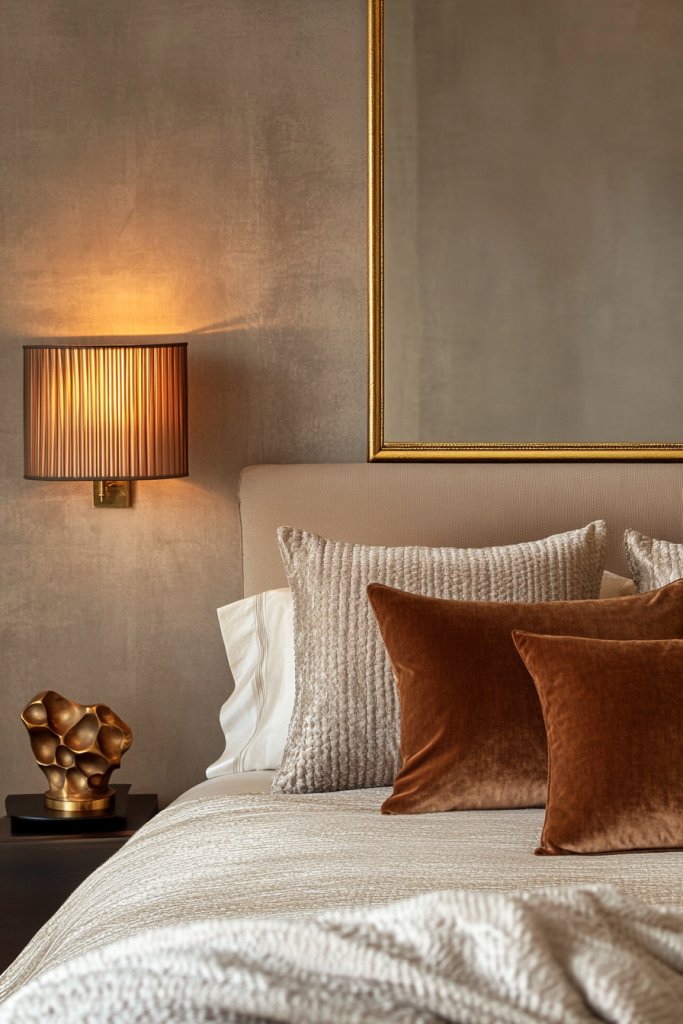 Picture a room with brass or gold fixtures—perhaps a mirror frame or drawer pulls—that catch the light beautifully. A sleek bedside tray or decorative sculpture adds a touch of shimmer, complementing matte or textured surfaces. Soft lighting highlights these accents, creating a warm, inviting glow. The overall vibe is sophisticated, with just enough sparkle to catch the eye.