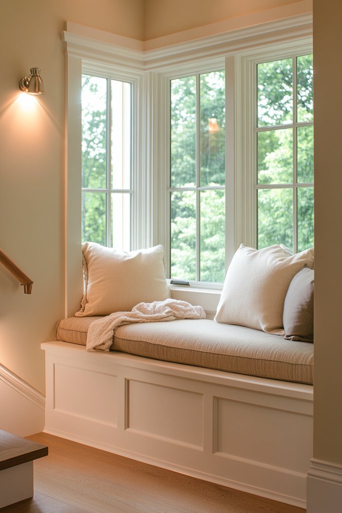 Imagine a built-in window seat layered with plush cushions, throws, and a few decorative pillows. Natural light streams in, illuminating the soft fabrics and creating a warm, inviting glow. Little touches like a small side table or a string of fairy lights add charm, making this spot perfect for unwinding or enjoying your morning coffee. It’s your personal sanctuary within the bedroom.