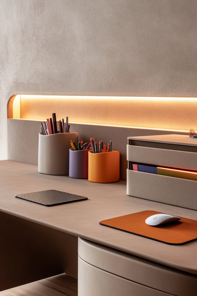 Picture a sleek desk with a tidy array of stationery stored in colorful containers or drawer organizers. Adjustable LED strips or clip-on lights provide warm, adjustable illumination that reduces eye strain and creates a relaxed vibe. Decorate your desk with a few favorite items—like a sculptural pen holder or textured mouse pad—to add personality. The overall setup is both functional and visually appealing, making study sessions more enjoyable.