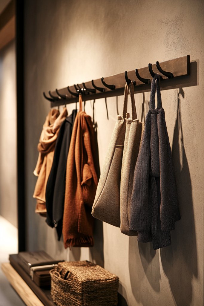 Imagine a wall-mounted rack with sleek, metallic hooks holding your favorite jackets, scarves, or bags. The hooks serve as both storage and decorative accents, creating an industrial or modern vibe. The organized display makes getting dressed faster and more fun, turning your closet into a mini art installation. The open, accessible setup encourages you to keep things tidy.