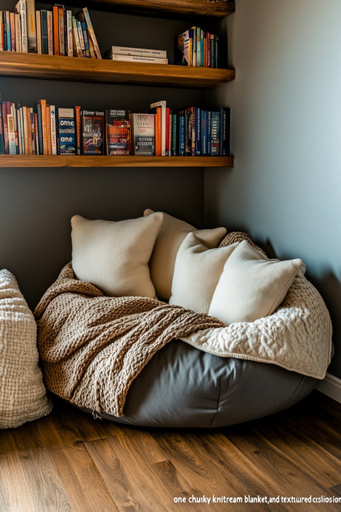 Picture a snug corner bathed in soft ambient light, with a plush bean bag that molds perfectly to your shape. Surround it with layered textiles—a chunky knit throw, a soft cream blanket, and textured cushions in muted tones. The scent of fresh fabric and the gentle sound of a nearby bookshelf filled with their favorite titles complete the scene. It’s an inviting, tactile haven that beckons them to settle in for hours.