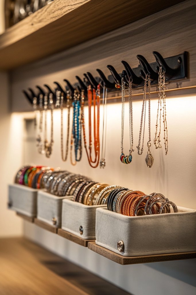 Imagine a sleek, wall-mounted frame with multiple hooks and small fabric-lined compartments. Behind it, a row of colorful bangles and layered necklaces hang neatly, catching the light. Nearby, a vintage-inspired stand displays rings and earrings, adding an artistic vibe. The space feels curated yet functional, with everything in easy reach and beautifully displayed.