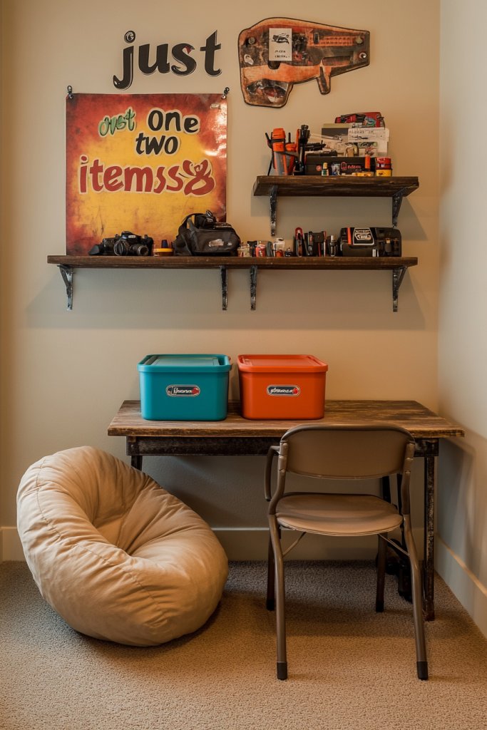 Visualize a cozy nook with a small worktable, colorful storage bins, and wall-mounted shelves filled with their tools and gear. Bright posters, custom decals, or themed fabric curtains set the tone—whether it’s a music zone, art studio, or gaming hub. A comfy chair or bean bag invites them to spend hours immersed in their passion. The overall vibe screams personal expression and enthusiasm.
