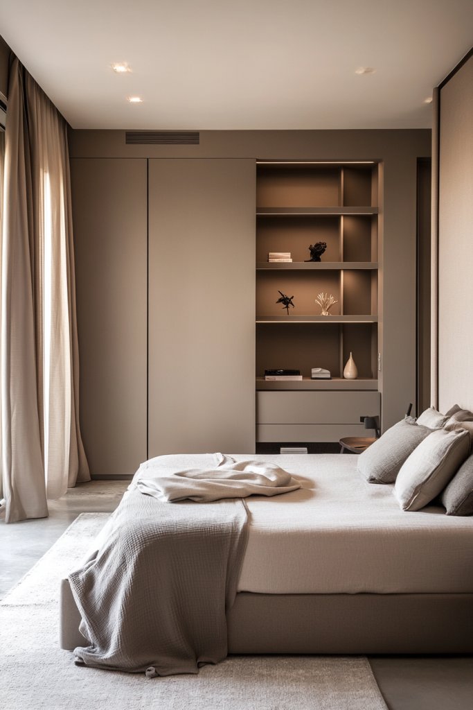 Imagine a room painted in soft taupe or cool gray, with sleek furniture featuring smooth surfaces and simple shapes. The space feels open, with hidden storage solutions keeping clutter out of sight. Natural light floods the room, enhancing the soft, muted palette. The overall effect is a tranquil haven that invites relaxation and mental clarity.