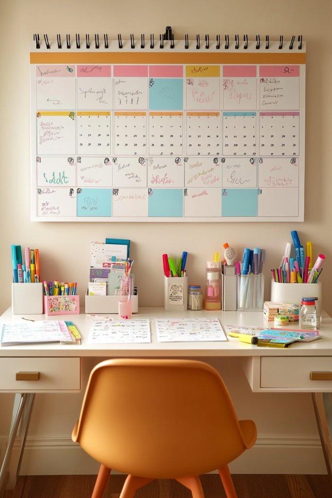 Imagine a colorful, stylish calendar hanging above a clutter-free desk. Bright markers, washi tapes, and decorative stickers make planning fun and personalized. The calendar features large blocks for notes, with space for doodles or motivational quotes. As you glance at it, you see a well-organized month filled with deadlines, birthdays, and goals, giving a sense of accomplishment and clarity. It’s a cheerful, motivating focal point.