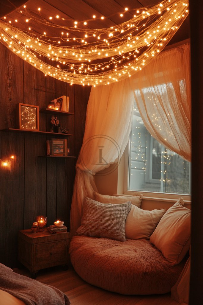 Visualize a soft curtain of fairy lights draped over your bed or a cozy corner, casting a gentle, flickering glow. The lights cascade from a simple ceiling hook or wall-mounted frame, creating a starry-night effect. The warm light reflects off textured fabrics or plush pillows, making your space feel like a private retreat. It’s like having your own piece of the sky inside.