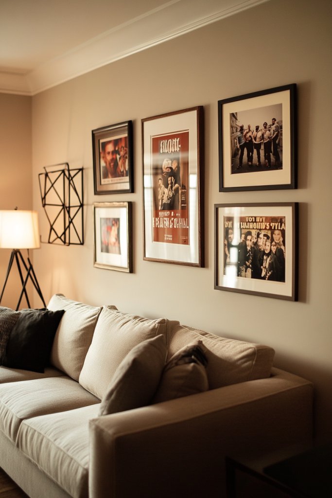 Imagine a wall filled with framed photos of friends, travel snapshots, or posters of your favorite bands and movies. Mix in some geometric or vintage frames for added style, arranging them in a balanced, asymmetrical layout. The wall becomes a visual story of your memories and passions. Soft lighting highlights the display, making it a focal point in your room’s design.