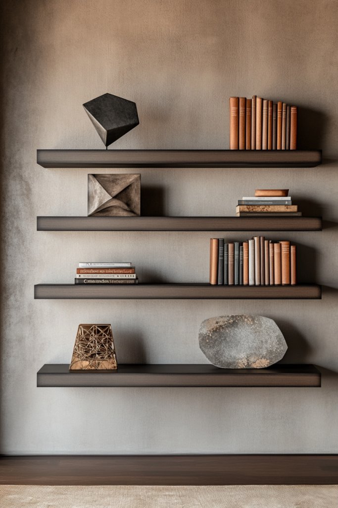 Imagine sleek, minimalist shelves floating against a painted wall, showcasing a curated collection of your prized possessions. Mix in some decorative objects—like geometric sculptures or textured ceramics—to add interest. The shelves create a layered, gallery-style display that draws attention and sparks conversation. The combination of open storage and clean lines makes your room feel modern and curated.