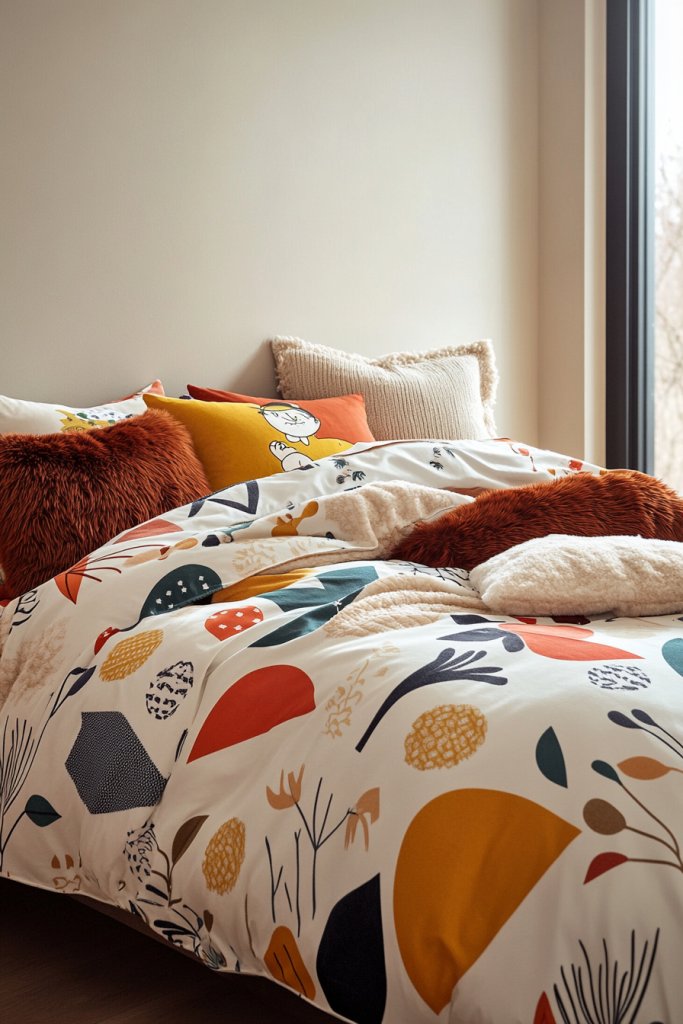 Picture a bed dressed with a duvet cover featuring bold, playful prints—such as geometric shapes, florals, or cartoon characters. Layer with textured throws or pillows in contrasting fabrics like velvet, faux fur, or knitted textures. Bright colors or monochrome palettes can set different moods—cheerful, cozy, or sophisticated. The mix of patterns and textures creates a lively, tactile experience that invites you to relax.