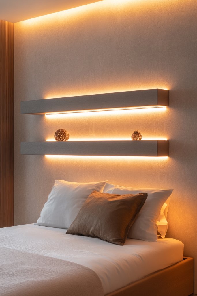 Picture a minimalist floating shelf mounted just above your nightstand, with a warm LED strip tracing its underside. The light softly glows, highlighting your favorite books or decor pieces without casting harsh shadows. The shelf’s clean lines contrast beautifully with plush bedding and textured throws, adding a layer of sophistication. The ambient glow enhances the room’s serenity, making it an inviting sanctuary.