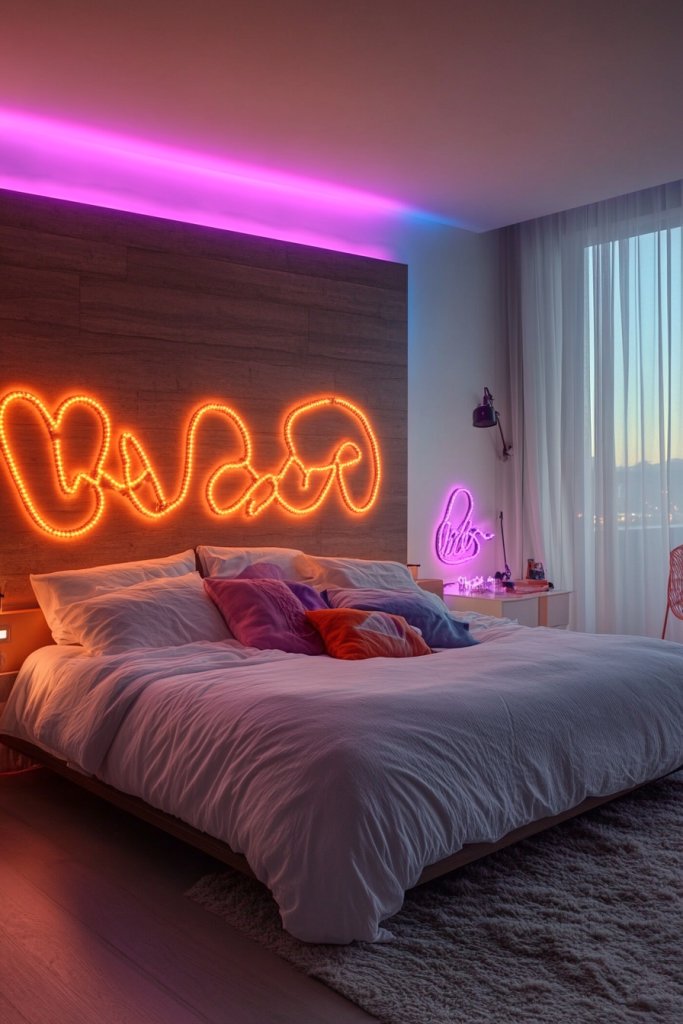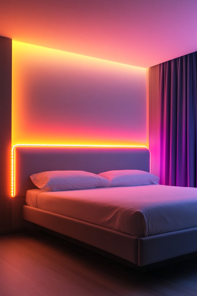 9. Neon LED Strip Lights Behind the Headboard for a Colorful Accent